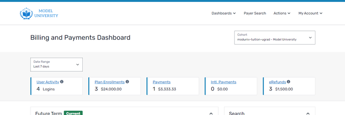You can see an overview of your institution using the Billing and Payments Dashboard. |