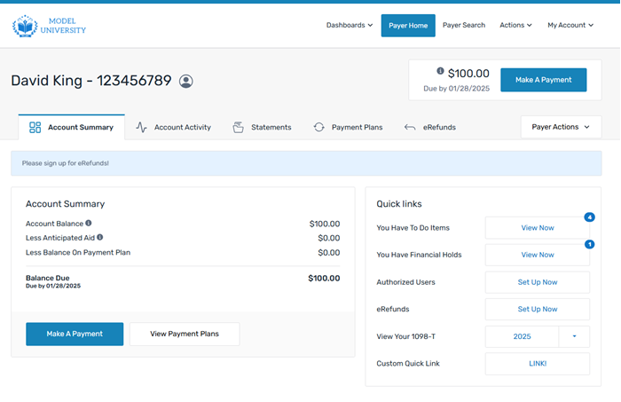 From the Account Summary tab, the payer can view additional features such as approved Authorized Users, the ability to enroll in eRefunds, and their 1098T tax forms.