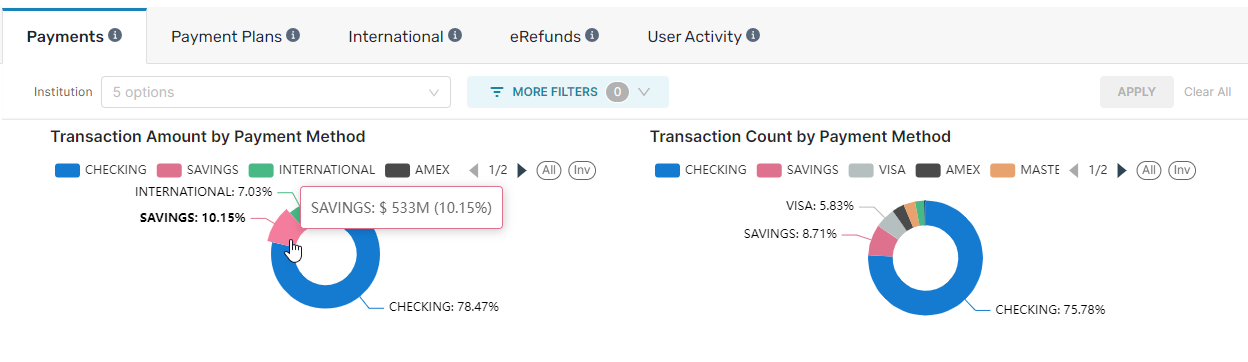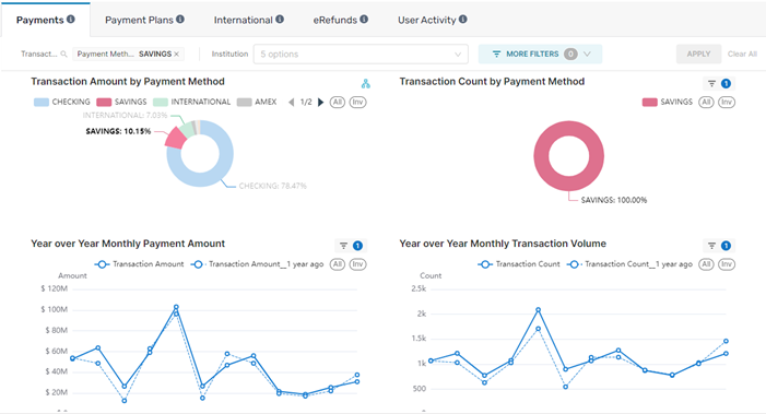 If you click on a segment, all of the charts and graphs on the tab will filter to focus on that information. For example, in the pie chart above, you can click on the Savings payment method. The other charts and graphs are filtered for that information and the filter updates to show what you selected. You can select information in another chart to further filter the displayed information.