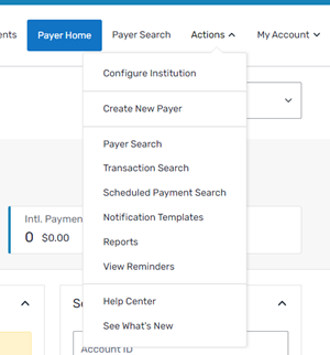 The Payer Search box can be used to find a student in your institution. On this screen, you can search by account ID (also known as student ID) or email address. If you need a more comprehensive search, you can click the Payer Search link to use the Payer Search page or the Transaction Search link to use the Transaction Search page. ![]()