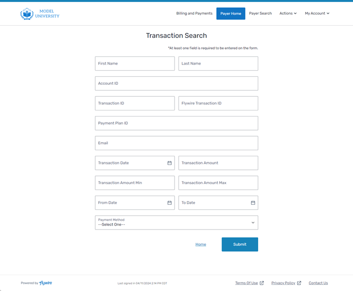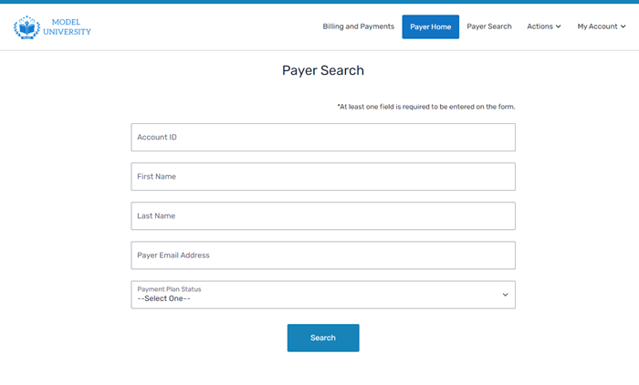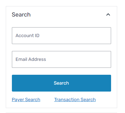 The Payer Search box can be used to find a student in your institution. On this screen, you can search by account ID (also known as student ID) or email address. If you need a more comprehensive search, you can click the Payer Search link to use the Payer Search page or the Transaction Search link to use the Transaction Search page.