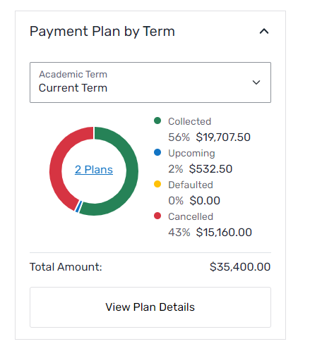 The Payment Plan by Term box displays a quick summary of all the plans within the same term. It displays a breakdown of the payment plans by status and a sum total amount. You can view a summary of any of the terms available in the term calendar. You can click the following links: