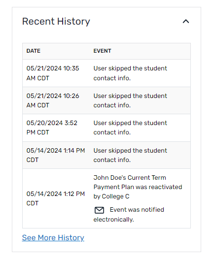 The Recent History box displays a list of your actions in the SFS. The list includes actions you have taken, but no student or Authorized User actions are included. |
