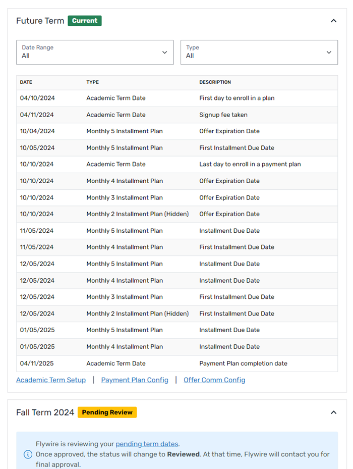The term calendar displays key dates for your terms in chronological order. The calendar overview shows the dates for current, future, and past terms up to 15 months in the past. Each term is displayed in its own term box and can be filtered by date range and the type of payment plan configured for that term. For each term box you can click the following links: