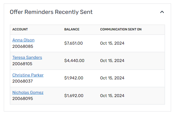 The Offer Reminders Recently Sent box displays a list of your accounts that were sent an offer reminder in the past 7 days. |