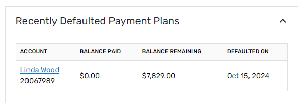 The Recently Defaulted Payment Plans box displays a list of your accounts with payment plans that have defaulted in the past 7 days. |