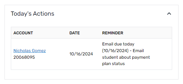 The Today's Actions box displays collector actions that are past due or scheduled to be done today. You can click a student's name to open their Payer Home dashboard. Collector actions are action events that are included in the Payer Timeline. When you add an Action, you must select a specific type of communication action that occurred or that you want to schedule. The Actions will displays with the schedule communications and events on the payer timeline. |
