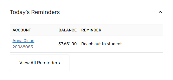 The Today's Reminders box displays your reminders that are past due or due today. You can click a student's name to open the Payer Home dashboard for the student or click the View All Reminders button to open the Reminders page. A reminder is a notification you can add to a payer's account for you to take action at a later date. The reminder displays as a blue banner with a notification that you have reminders that require your attention. This banner displays below the SFS title bar.