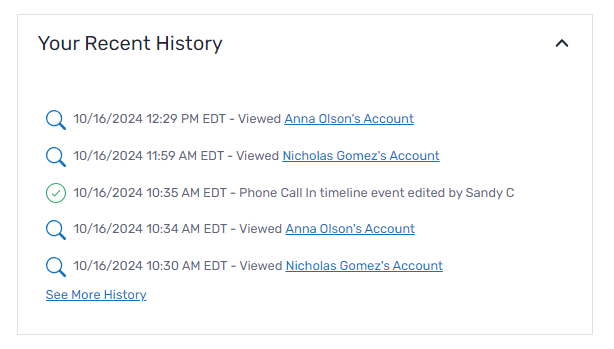 The Your Recent History box displays a list of your actions in the SFS. The list includes actions you have taken, but no other collector or student actions are included. |
