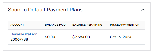The Soon to Default Payment Plans box displays a list of accounts on payment plans that recently missed an installment(s) and will default if they do not make their next installment. This is may be an opportunity to reach out to the student to advise them of their status and help the school understand the student's situation before the student defaults. |