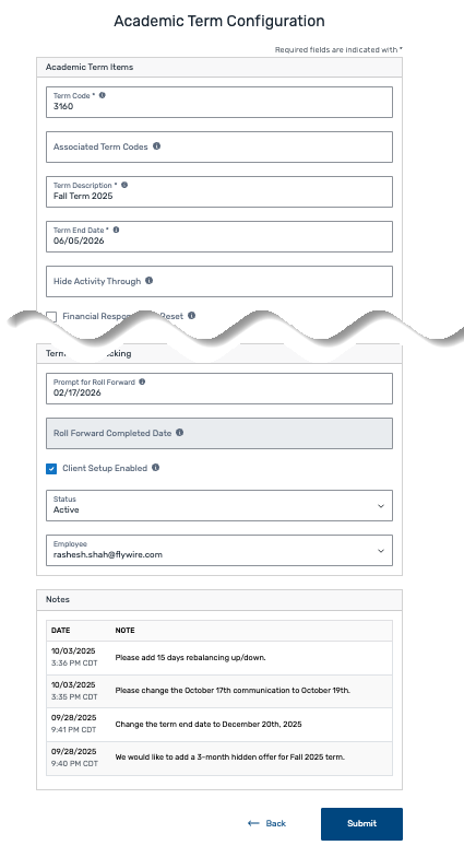 On the Academic Term Configuration page, you can view the configuration and notes from the completed term setup wizard process.