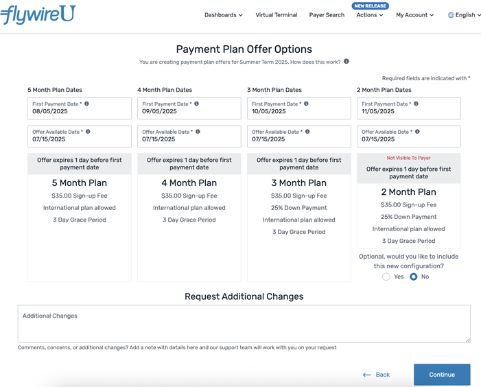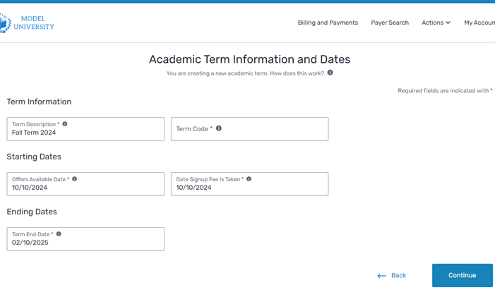 The term setup wizard will help you roll term setup forward a year. It is a joint effort between you and Flywire support that is conducted fully within the SFS system. At the start, you will be prompted with data based on the corresponding term in the prior year. You can update dates and certain key values directly and request additional changes. Flywire Support will review the term dates, work with you to make any necessary adjustments, and send you the configuration for final approval.