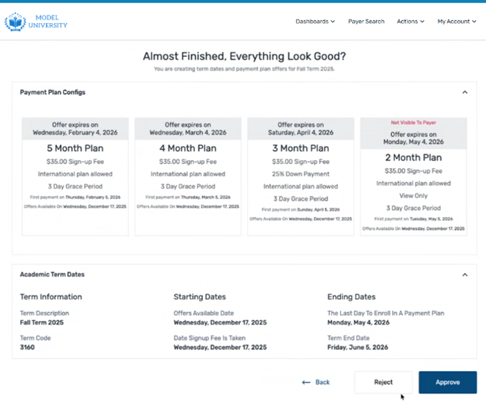 If you reject the term setup, the term status returns to Pending Review and Flywire Support will address your comments.