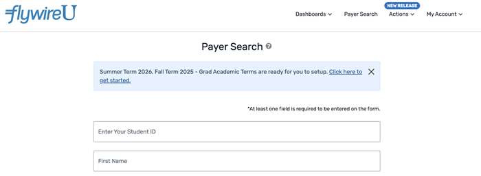 Flywire will prompt you to provide new term information. Depending on your preferences, Flywire can prompt for one term at a time or for all terms in the academic year at the same time. |