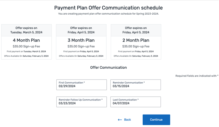 On the Payment Plan Offer Communication schedule page, review the dates the offer communications will be sent. You can update the dates for each option.