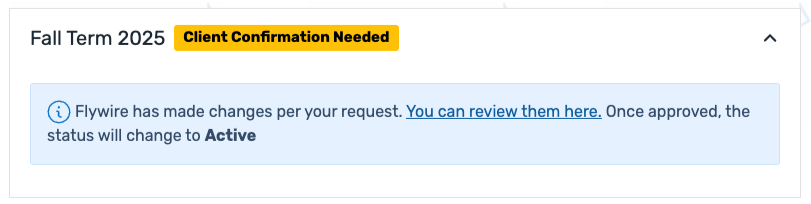 When Flywire Support has completed a review of the upcoming term or finished completing planned changes, they will update the term status to Client Confirmation Needed.