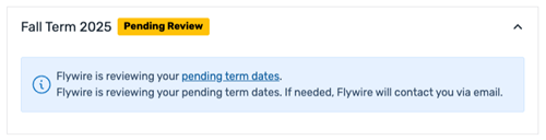 The Pending Review status indicates that you have submitted the term data. Flywire Support will review the information submitted and make any necessary updates. You will see the Pending Review status indicator on the Billing and Payments Dashboard page. You can also reach out to Flywire Support with any follow up questions or comments.