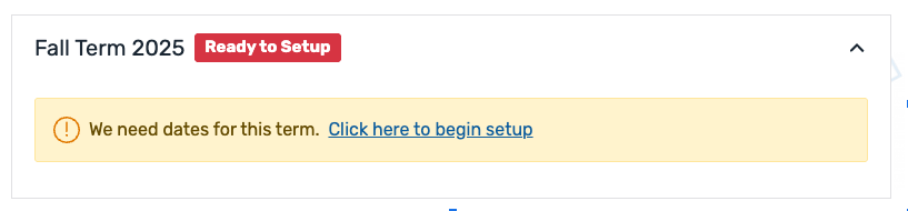 The Ready to Setup status indicates the term is ready to be configured with term dates and offer configuration. When the term is in this status, you can click the 'Click here to begin setup' link or the 'Click here to get started' link to open the term setup wizard.