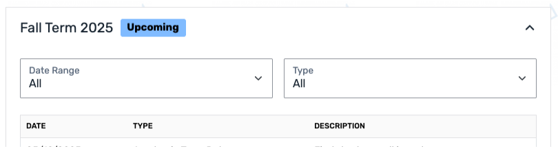 Once the term is active, it displays as Upcoming while it is still in the future.