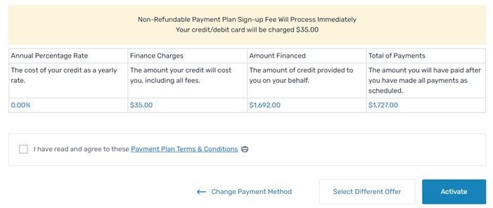 The TILA displays on the payment plan activation page and requires acknowledgment by the payer. It is available to print as mpart of the payment plan terms and conditions print page.