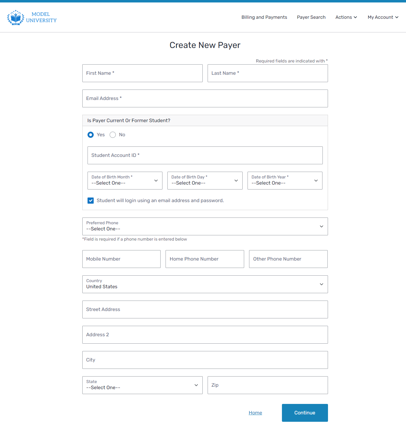 You can create and update payer contact information in the SFS. A payer account is used by a student or Authorized User to view, pay, and manage their bill.