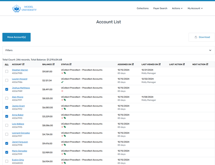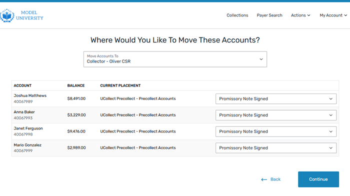 You can use the Move Accounts action to move student accounts to a different phase in the collections process. You can move an account between individual collectors, move accounts to a shelved 'bucket', or move accounts into placement with a third party.