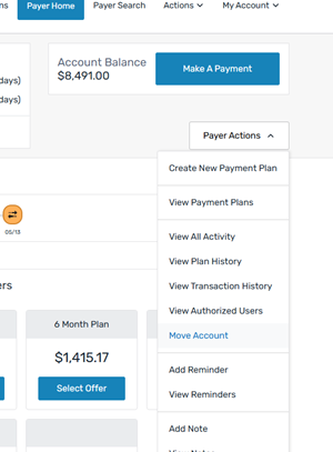 On the Payer Home page, click the Payer Actions menu and select Move Account.
