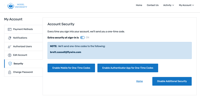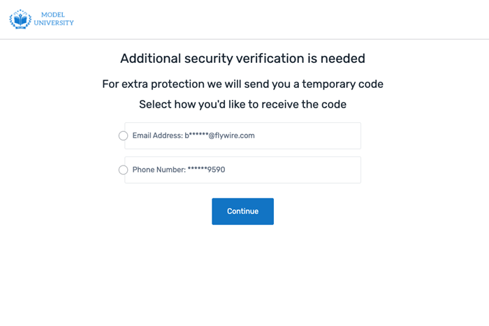 Multi-factor authentication is when a user logs into the SFS and a second method of verification is requested by Flywire. A user who has enabled multi-factor authentication will be required to enter a code after they enter their username and password.