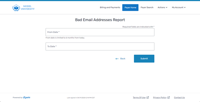 On the Bad Email Addresses Report page, enter the dates you want to include in the report.