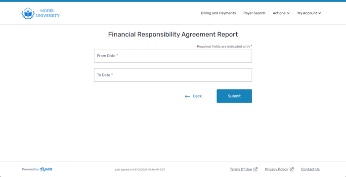 On the Financial Responsibility Agreement Report page, select the dates you want to use to populate the report.