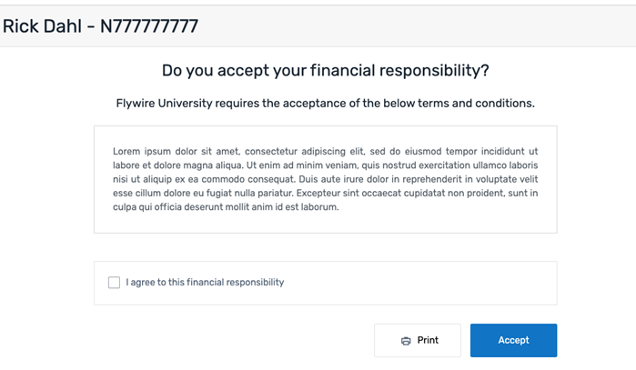 The SFS can collect a Financial Responsibility Agreement (FRA) on behalf of your institution. An FRA outlines and informs students of their financial obligations and responsibilities to you and explains the potential consequences if a student fails to meet those obligations. The FRA can also be used to collect additional agreements, such as consent to communicate electronically or consent to provide a 1098t online.