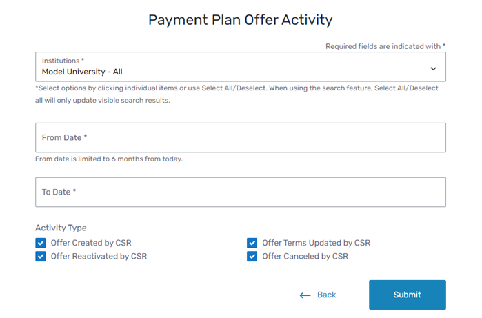 The Payment Plan Offer Activity report lets you filter payer activity information based on your institutions, activity type, and a specific period (up to 6 months). The report shows offer information such as when an offer was reactivated by an admin, whether the payer can reactivate the offer, and when the offer was created and updated.