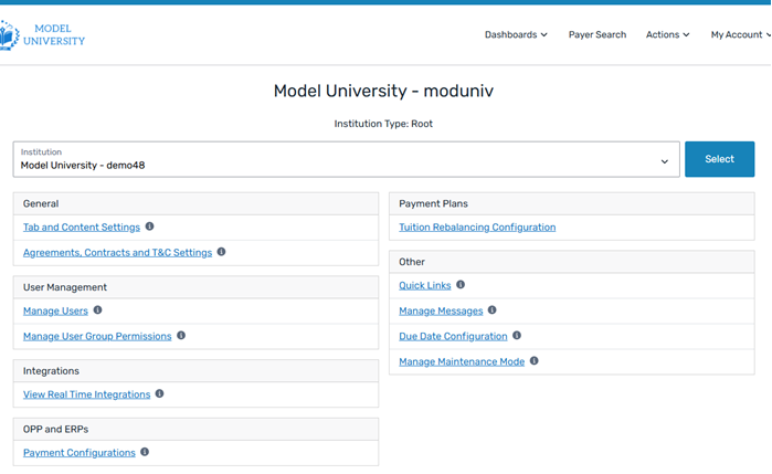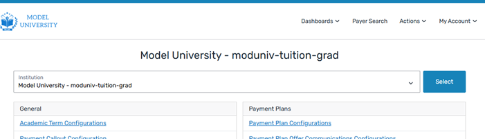 The name of the [Institution name] page will change to the name of the institution you selected. For example, if you are changing from the Model University root to the graduate institution, the name of the [Institution name] page updates to Model University - moduniv-tuition-grad.