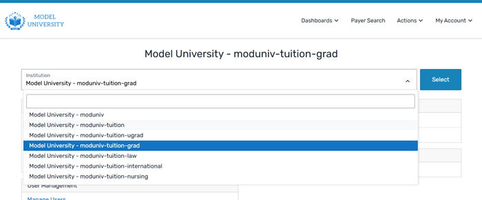 To change the institution using the institution toggle, select the institution from the drop-down list and click the Select button.
