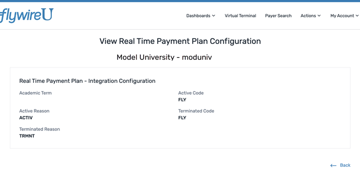 Clicking the View action on the View Real Time Integrations page opens the Configuration page for the integration. For example, if you have a real-time payment plan (RTPP) integration, you will see the View Real Time Payment Plan Configuration page.
