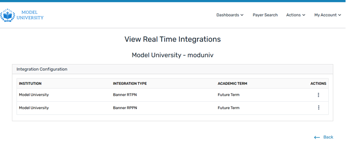 On the View Real Time Integrations page, you can view the integrations for your institution or sub-institution.