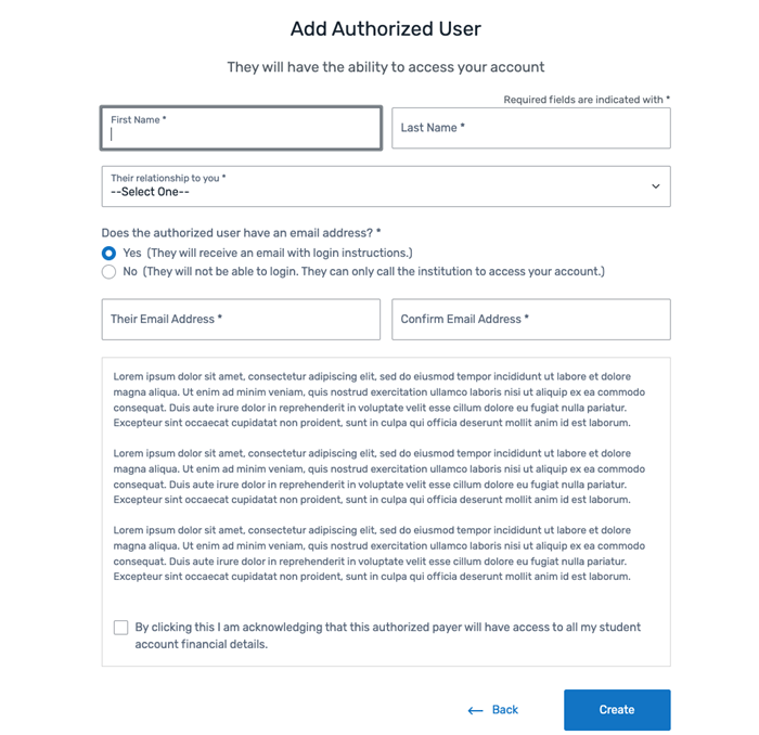 When a student grants the Authorized User access, they will have access to financial details and personal information in the student's account. Giving a person authorized user access means the student has agreed to release private information that is protected by laws such as the United States (US) Department of Education Family Education Rights and Privacy Act (FERPA).