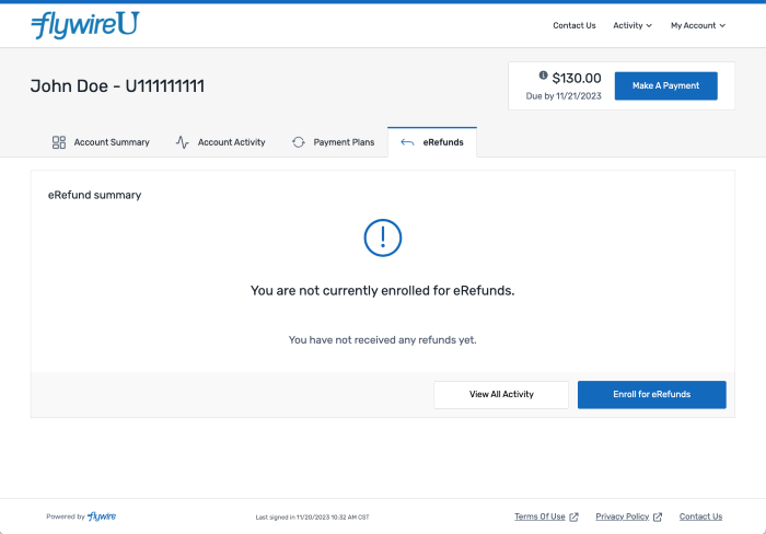 A student or Authorized User can enroll in eRefunds when the eRefunds tab is available on the Account Summary tab of the Payer Home page.